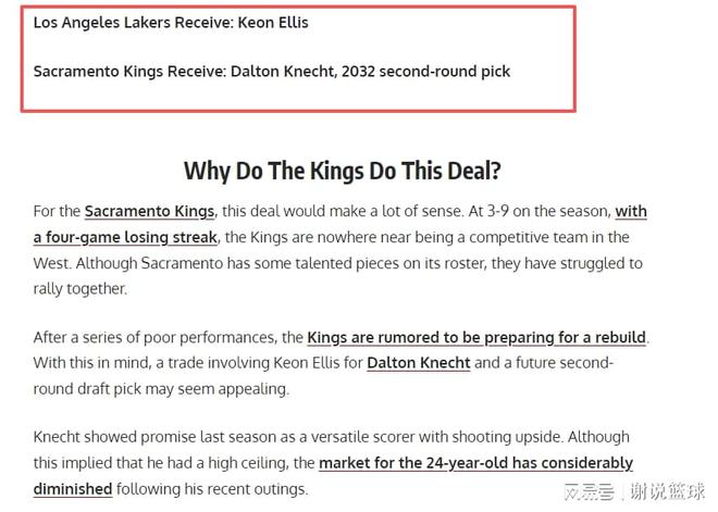 媒体FW就支招湖人,可以考虑从国王交易来工兵基恩-埃利斯,在具体方案这边,湖人二年级射手道尔顿-克内克特,会被放上货架。此外湖人再送一个来自2032年次轮签,考虑到克内克特行情很低,市场价值忽略不计,也就是湖人差不多用2-3个次轮签左右筹码,就换来基恩-埃利斯,那肯定还是值得尝试。